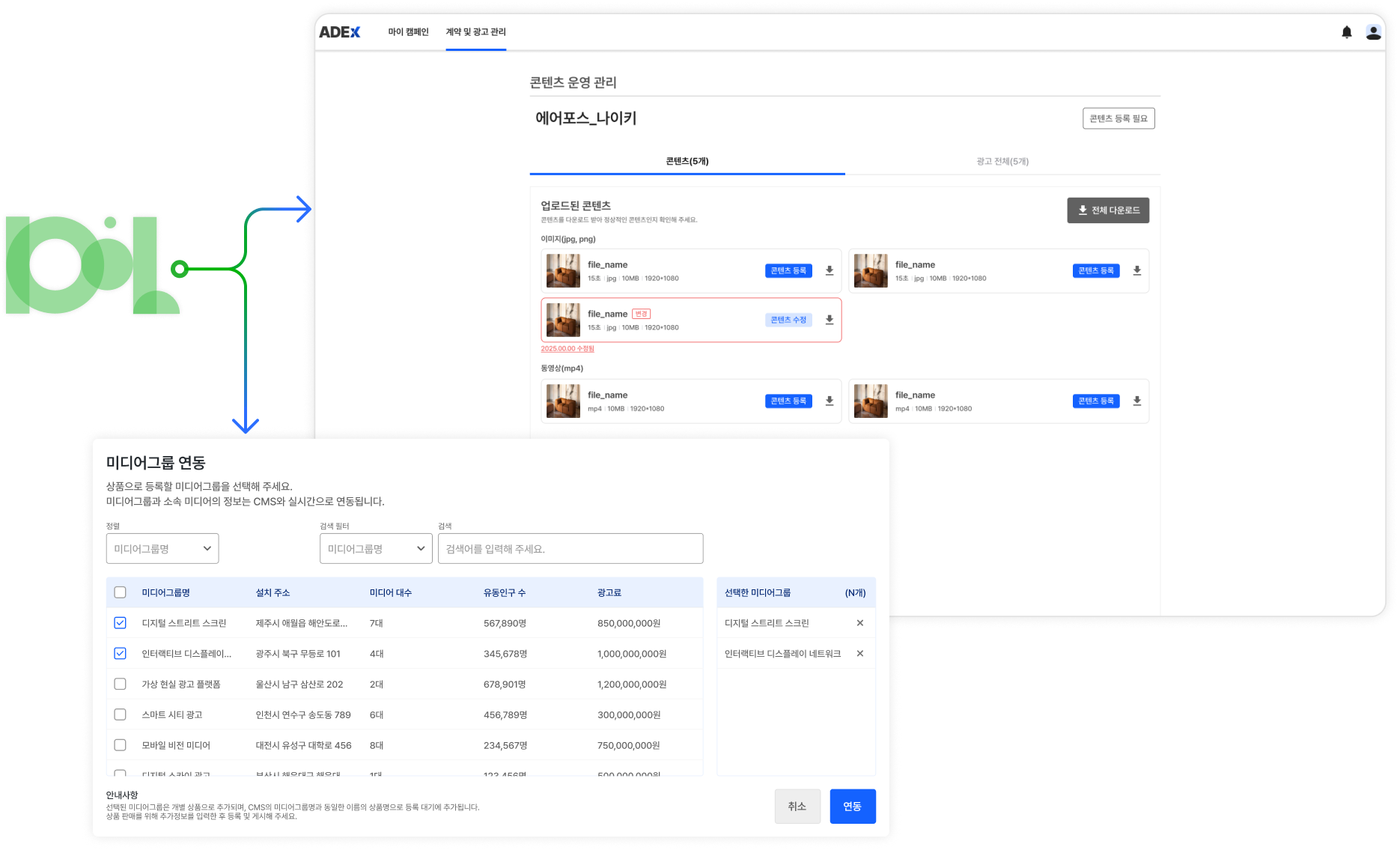 Dooh Service 연동을 통해, 미디어사는 기존 미디어그룹을 손쉽게 불러오고 콘텐츠·스케줄 등록을 간단한 프로세스로 진행할 수 있습니다.