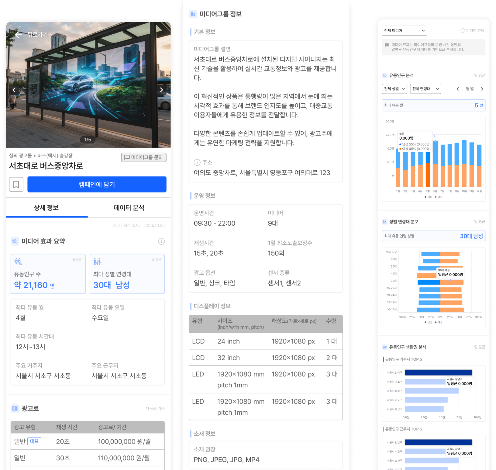 유동인구·타깃 오디언스 등 정량 지표 기반으로 미디어 가치를 투명하게 분석하고, 설치 위치·유동인구·가격·운영 옵션 등 표준화 지표를 한 화면에서 확인할 수 있습니다.