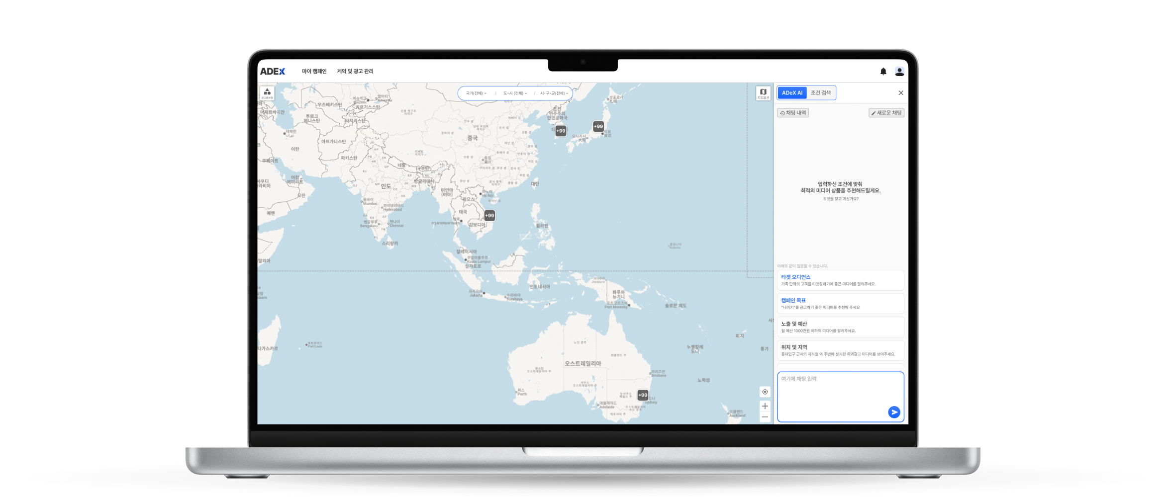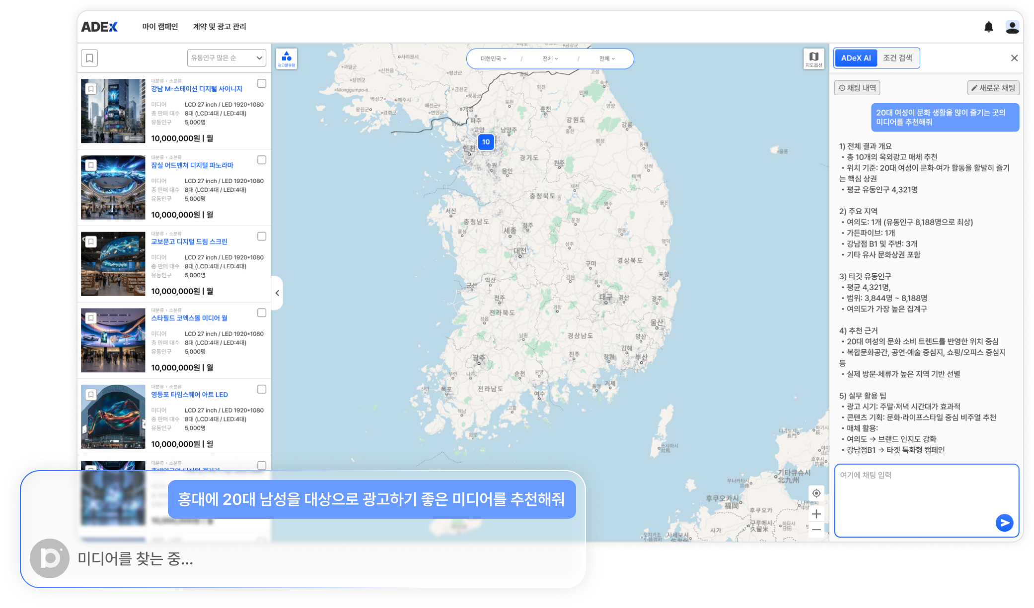 캠페인 목적·타깃·예산 입력 기반으로 ADeX AI가 최적 미디어를 자동 추천하고, 위치 정보·유동인구 히트맵·설치 지점 시각화를 통해 매체를 직관적으로 비교할 수 있습니다.