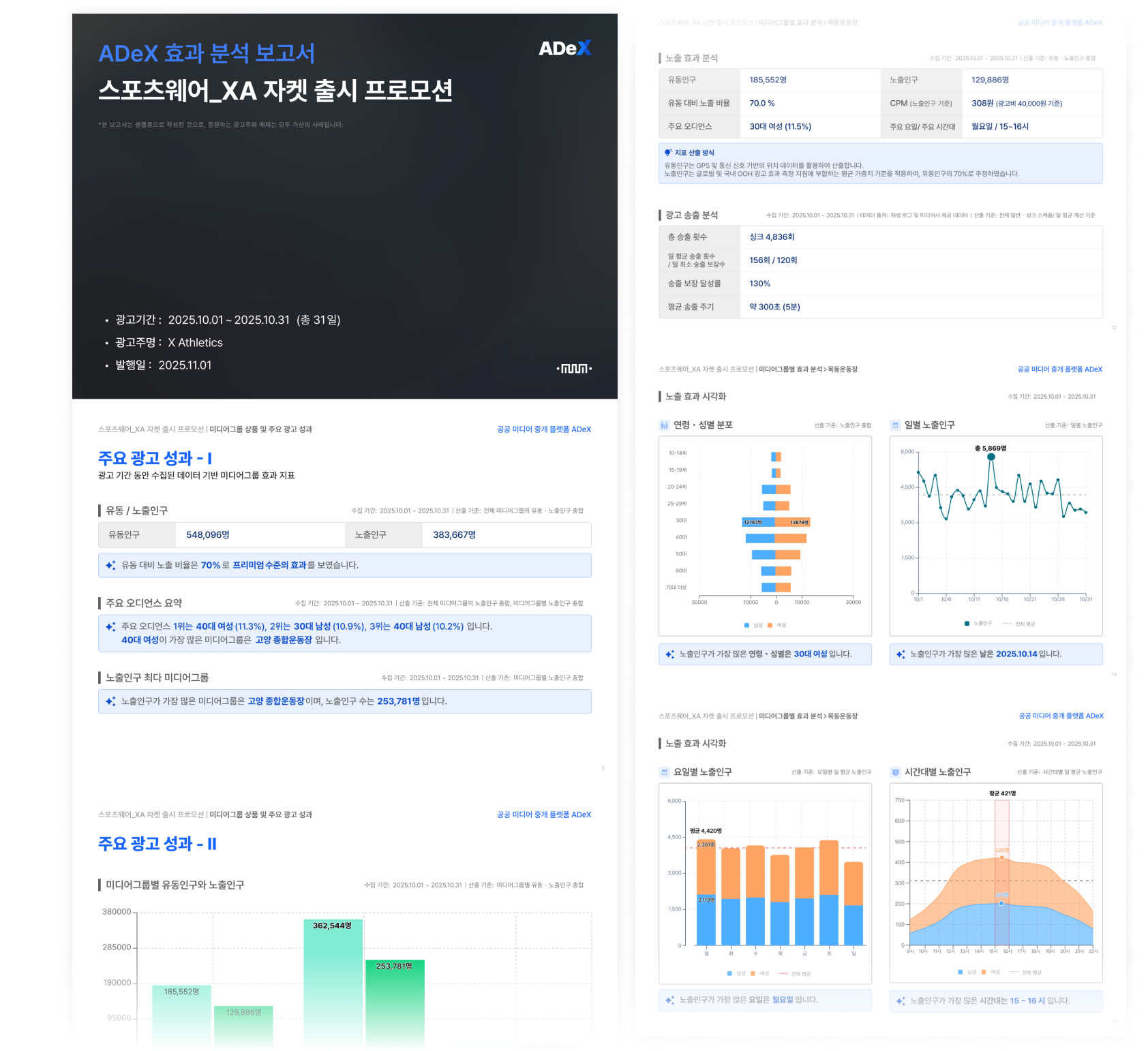 유동인구·노출 추정·오디언스 분석 등 광고 성과를 정량 데이터 기반의 ‘ADeX 효과 분석 보고서’로 확인할 수 있어, 시장의 투명성을 확보합니다.